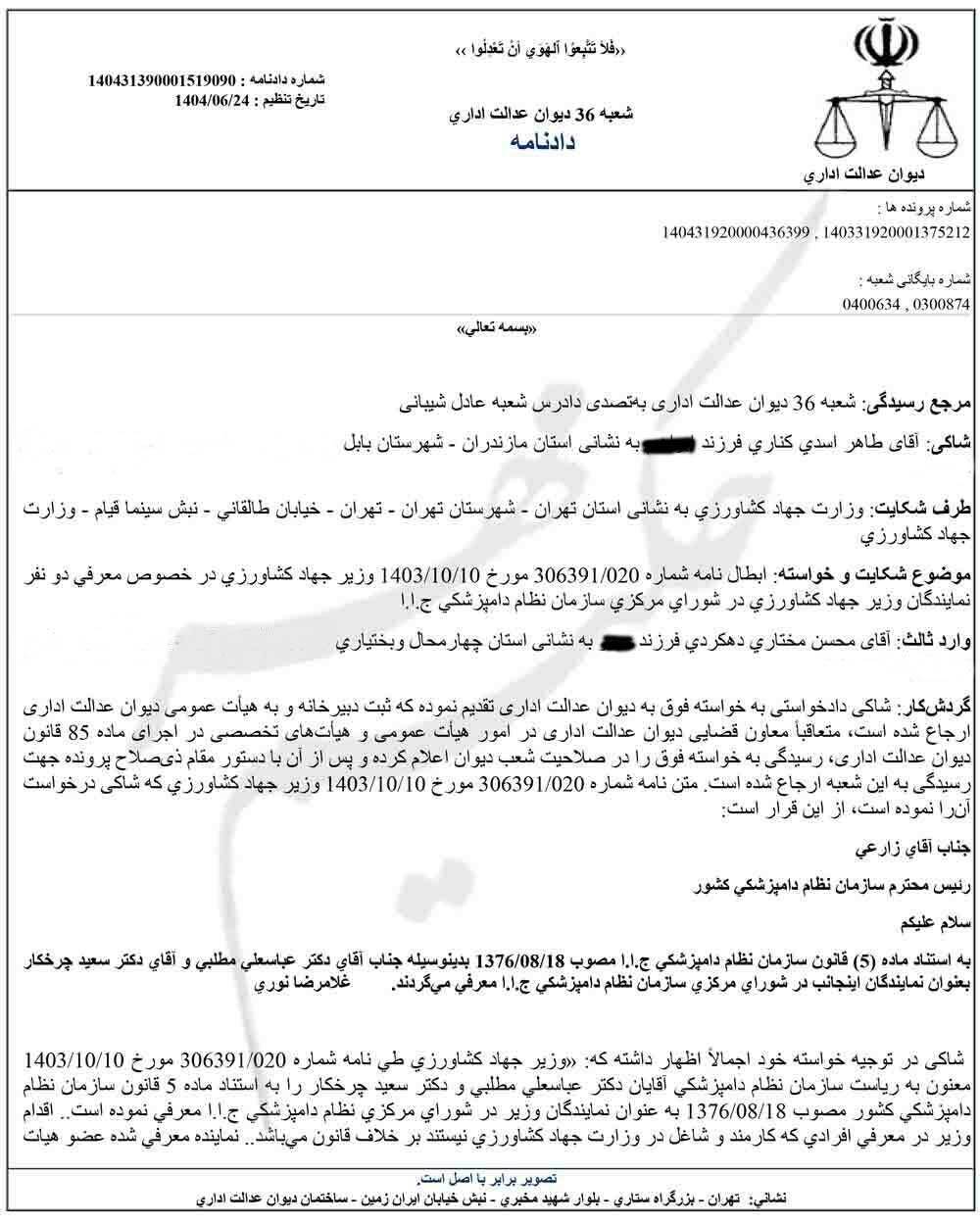 بر اساس حکم بدوی اخیر دیوان عدالت اداری، مکاتبه مربوط به معرفی «دکتر عباسعلی مطلبی» به عنوان نماینده وزیر در شورای مرکزی سازمان نظام دامپزشکی، به دلیل بازنشستگی وی ابطال گردیده است ولی حضور «دکتر سعید چرخکار» در این شورا بلامانع اعلام شده است. البته این رأی، حکم اولیه بوده و در شعب تجدید نظر دیوان عدالت اداری، قابل اعتراض می‌باشد.