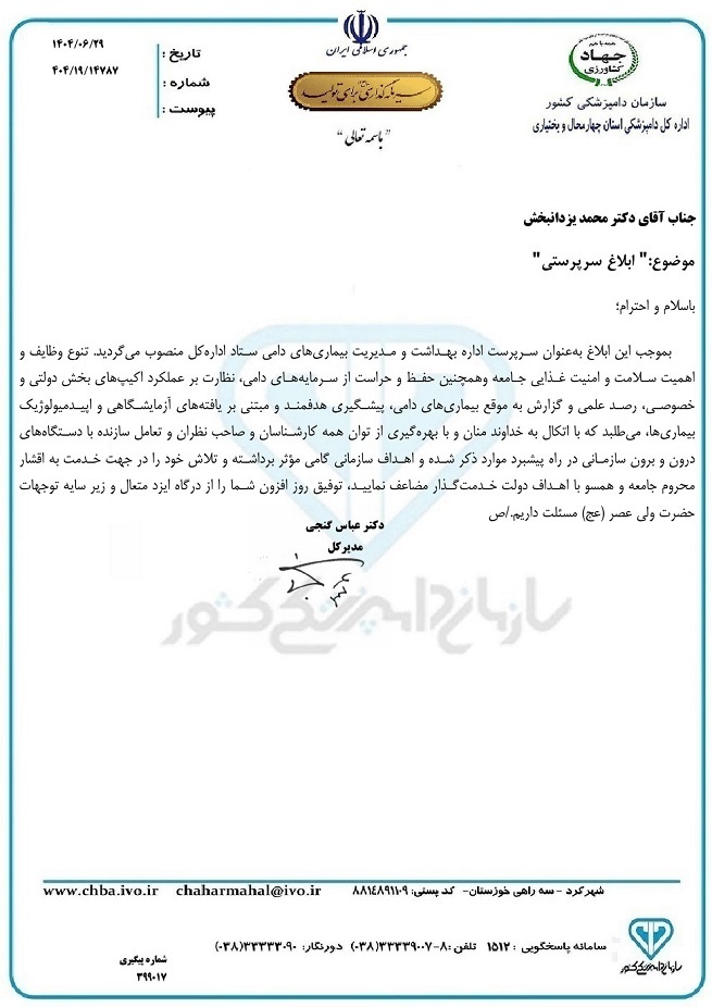 به گزارش حکیم مهر به نقل از روابط عمومی اداره کل دامپزشکی استان چهارمحال و بختیاری، طی حکمی از سوی «دکتر عباس گنجی» مدیرکل دامپزشکی استان، «دکتر محمد یزدان بخش» به عنوان سرپرست اداره بهداشت و مدیریت بیماریهای دامی این اداره کل منصوب شد.