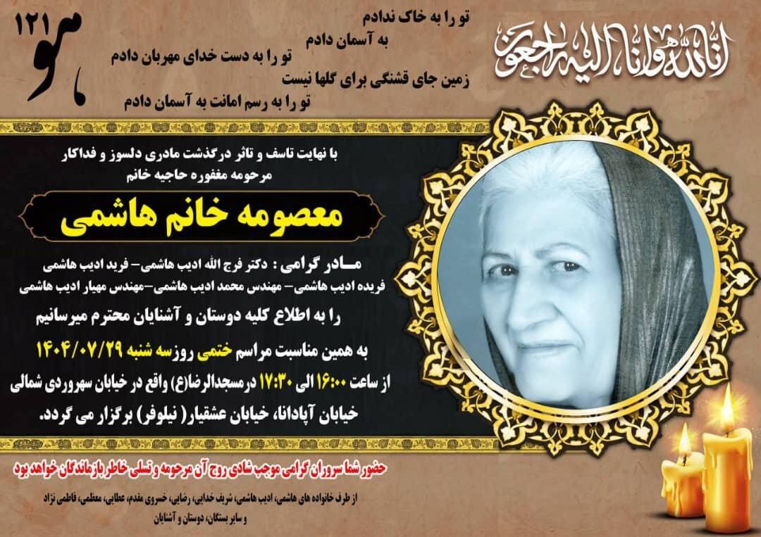 حکیم مهر: با کمال تأثر باخبر شدیم جناب آقای «دکتر فرجاله ادیبهاشمی» استاد پیشکسوت جراحی دانشکده دامپزشکی دانشگاه تهران در غم از دست دادن مادر خویش به سوگ نشستهاند.