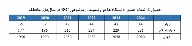 علویان مهر گفت: در رتبه بندی موضوعی ۲۰۲۴-ISC از ایران ۴۴ دانشگاه حضور دارند که در حوزه های مختلف موضوعی حائز رتبه شده اند؛ حضور دانشگاه ها در رتبهبندی موضوعی ISC در سال های مختلف در جدول چهار نشان داده شده است.