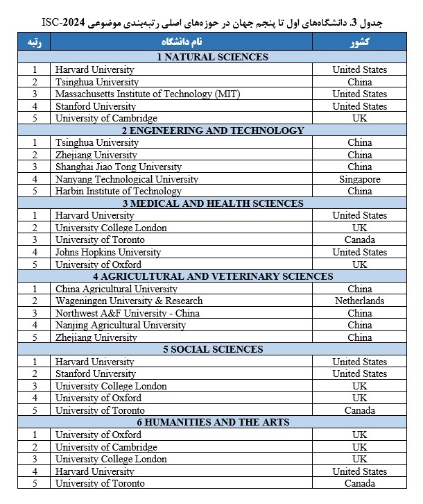 دانشگاههای اول تا پنجم جهان در حوزههای اصلی موضوعی در جدول سه نشان داده شده است.