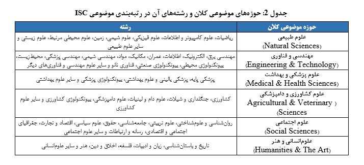 حوزههای موضوعی کلان و رشتههای آن در رتبهبندی موضوعی ISC در جدول ۲ قابل مشاهده است.