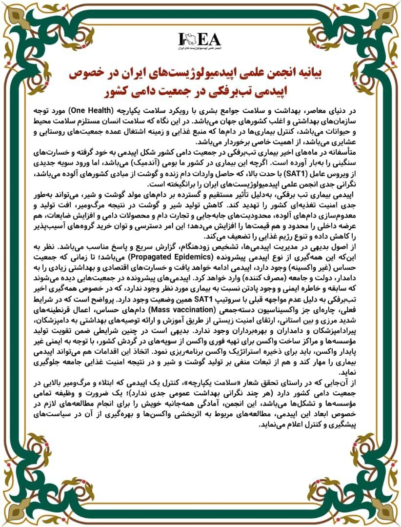 حکیم مهر: انجمن علمی اپیدمیولوژیستهای ایران در خصوص اپیدمی تب برفکی در جمعیت دامی کشور بیانیهای منتشر کرذ.