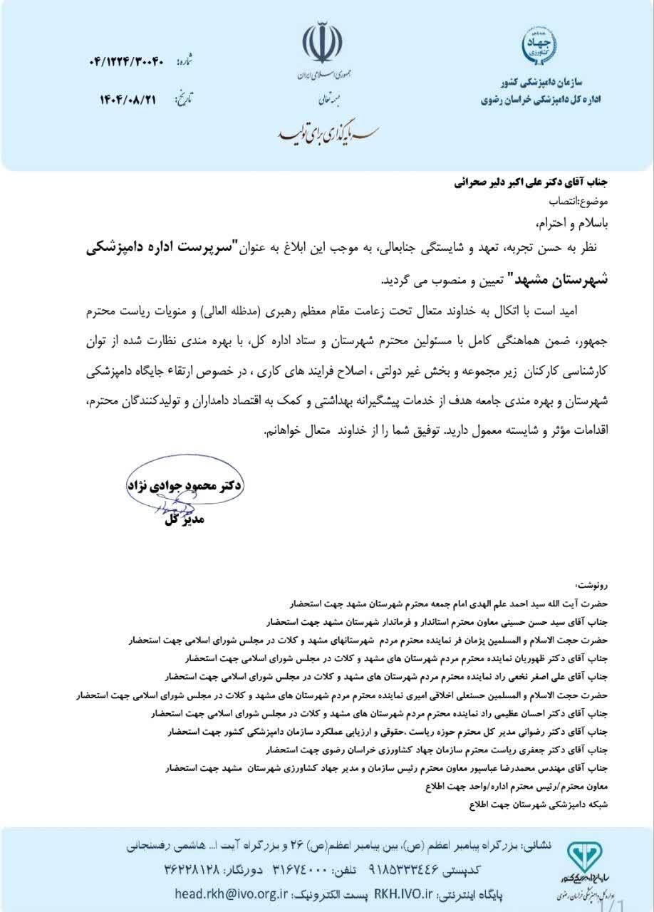 به گزارش حکیم مهر به نقل از روابط عمومی اداره کل دامپزشکی خراسان رضوی در حکم صادر شده از سوی دکتر جوادی نژاد آمده است: