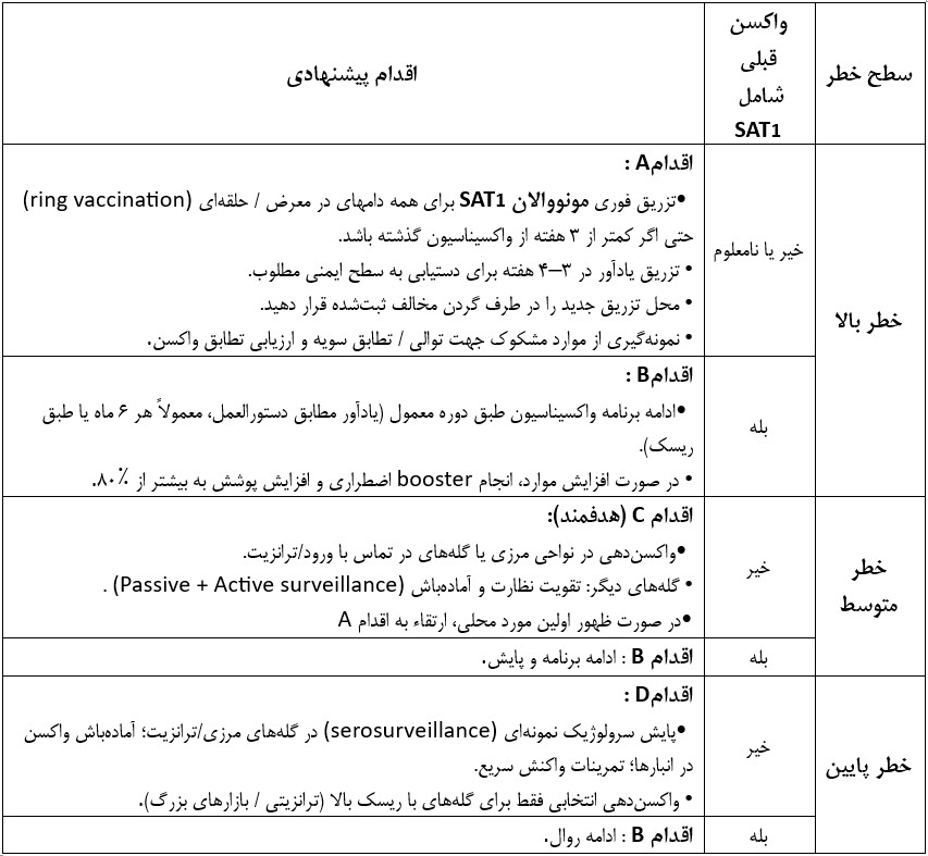 این جدول بر اساس سطح خطر اپیدمی و وضعیت واکسیناسیون پیشین دامها طراحی شده است و راهنمای عملی برای تعیین نوع واکسن، نحوه تزریق و اقدامات تکمیلی فراهم میکند. دامپزشکان و مدیران اجرایی میتوانند با استفاده از این جدول، تصمیمگیری سریع و هدفمند برای مقابله با سویه SAT1 ویروس تب برفکی انجام دهند.
