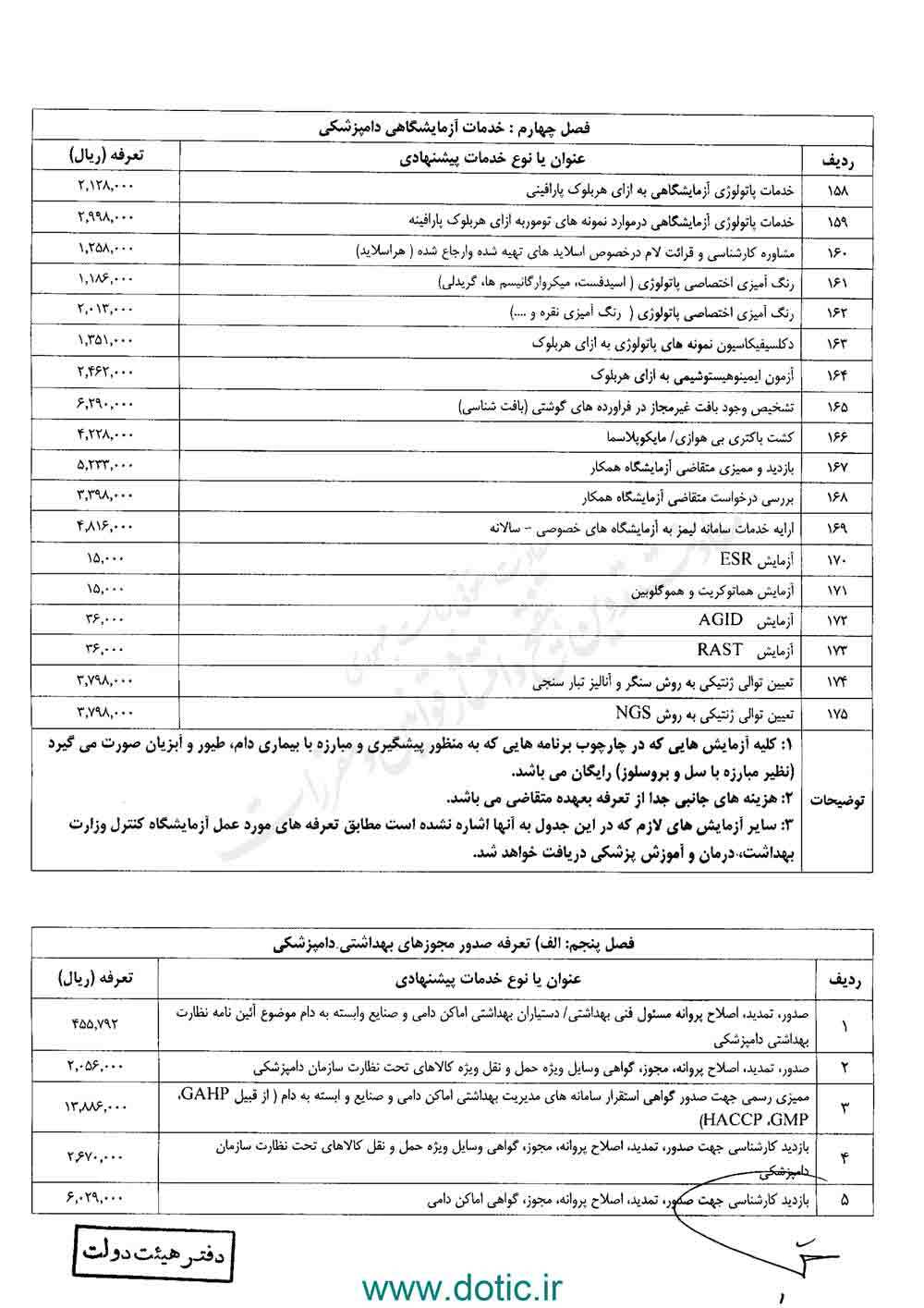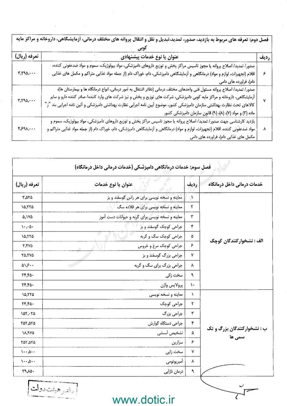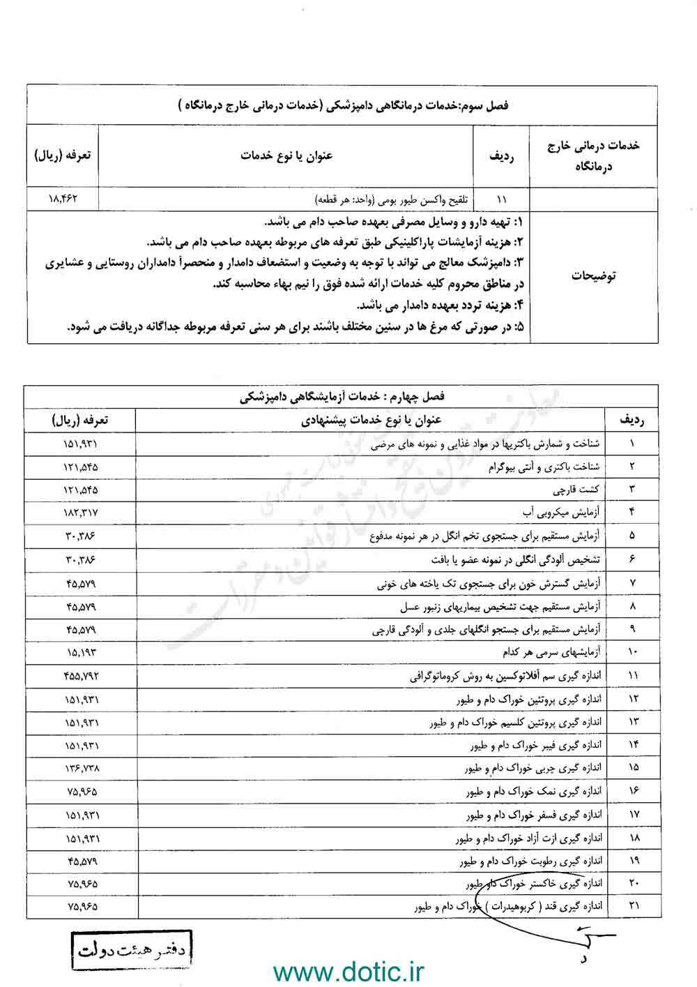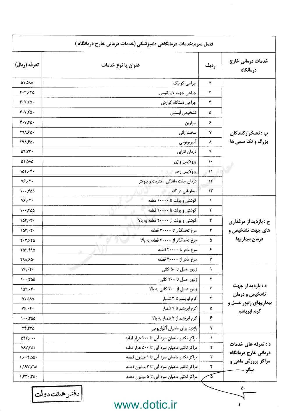 جزئیات تعرفههای جدید خدمات دامپزشکی بخش دولتی به شرح زیر میباشند: