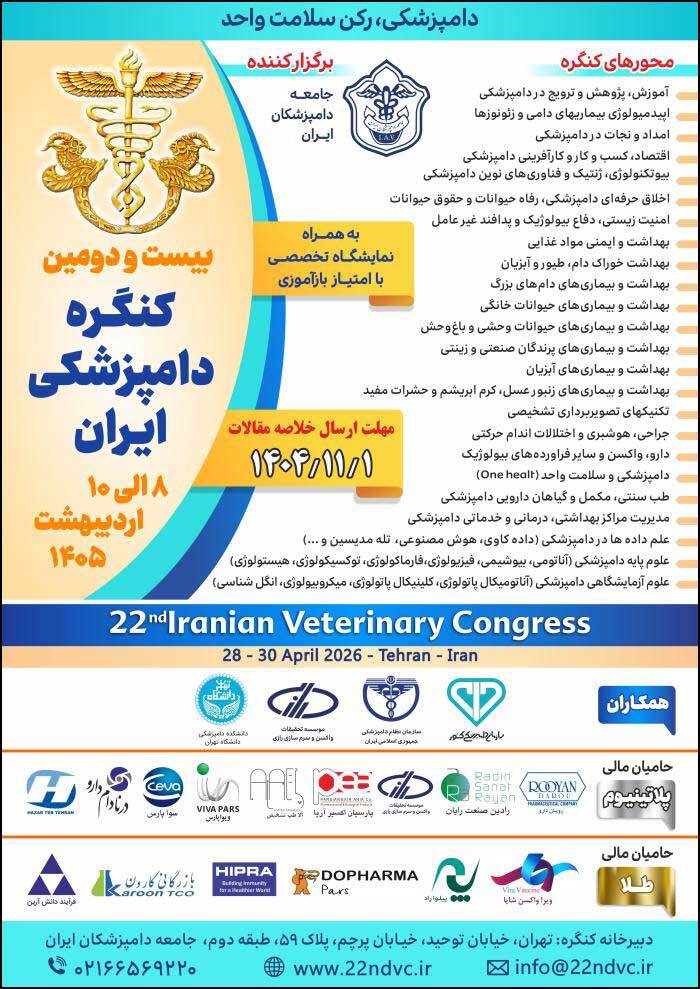 گفتنی است بیست و دومین کنگره دامپزشکی ایران و نمایشگاه جانبی آن از ساعت 9 الی 17 روزهای 8 لغایت 10 اردیبهشت ماه سال 1405 در مرکز همایشها و نمایشگاههای ایران مال واقع در بزرگراه شهید خرازی تهران برگزارخواهد شد.